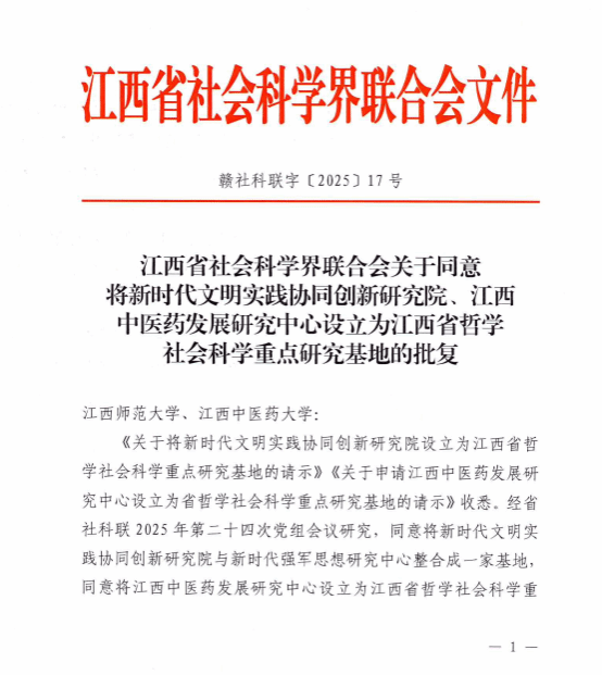 江中新闻网讯(通讯员 张珉 刘路华)近日,江西省社会科学界联合会批复同意将我校申报的“江西中医药发展研究中心”设立为江西省哲学社会科学重点研究基地。这是学校首个省哲学社会科学重点研究平台,标志着学校哲学社会科学方面建设取得重大突破。