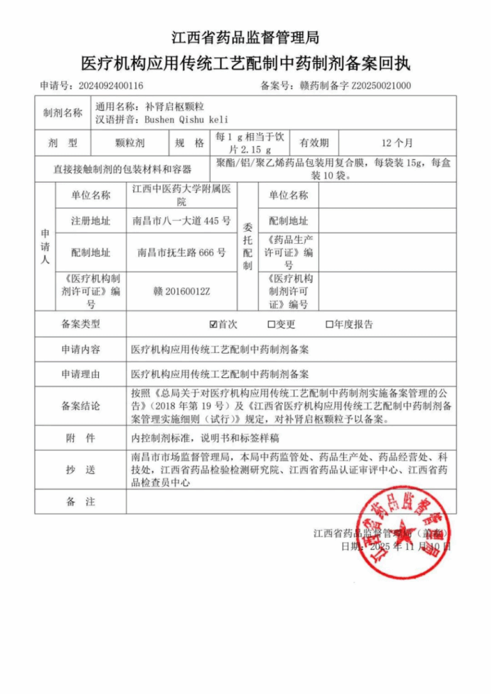 江中新闻网讯(通讯员 姚闽)近日,学校中药固体制剂制造技术国家工程研究中心(中药学新药创制方向学科特区)研发的“补肾启枢颗粒”顺利通过江西省药品监督管理局审批,成功取得医疗机构应用传统工艺配制中药制剂备案(备案号:赣药制备字Z20250021000)。