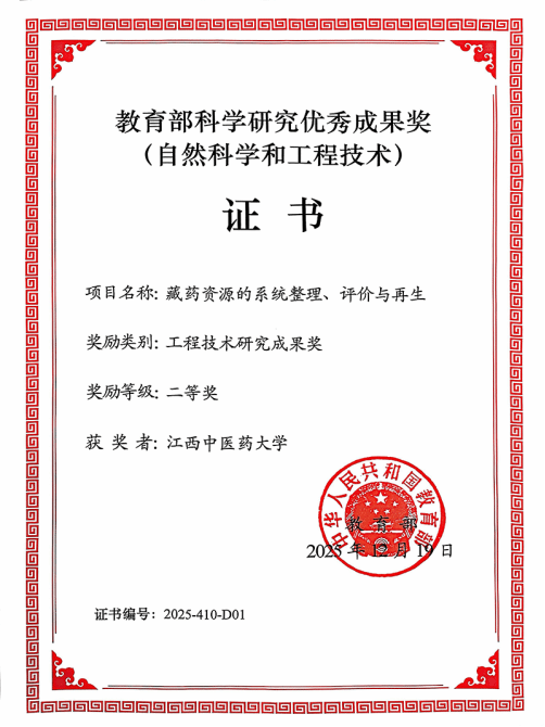 江中新闻网讯(通讯员 饶金龙 潘玲玲)近日,教育部公布了2025年度教育部科学研究优秀成果奖(自然科学和工程技术)名单,我校首席教授钟国跃主持的“藏药资源的系统整理、评价与再生”项目荣获2025年度教育部科学研究优秀成果奖(自然科学和工程技术)工程技术研究成果奖二等奖。